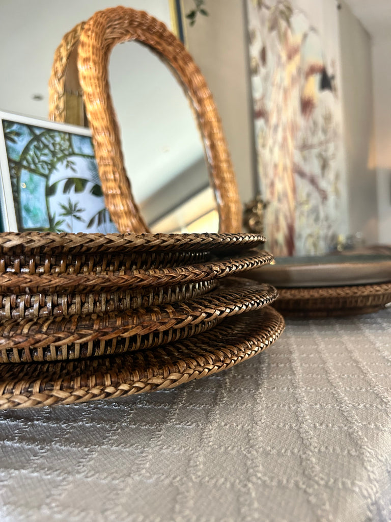 Deze set bestaat uit 5 grote onderborden gemaakt van stevig gevlochten riet. Perfect om je tafel mee te decoreren, maar ook erg leuk als onderbord om woonaccessoires op te etaleren. Mooi in een vintage of bohemian interieur.